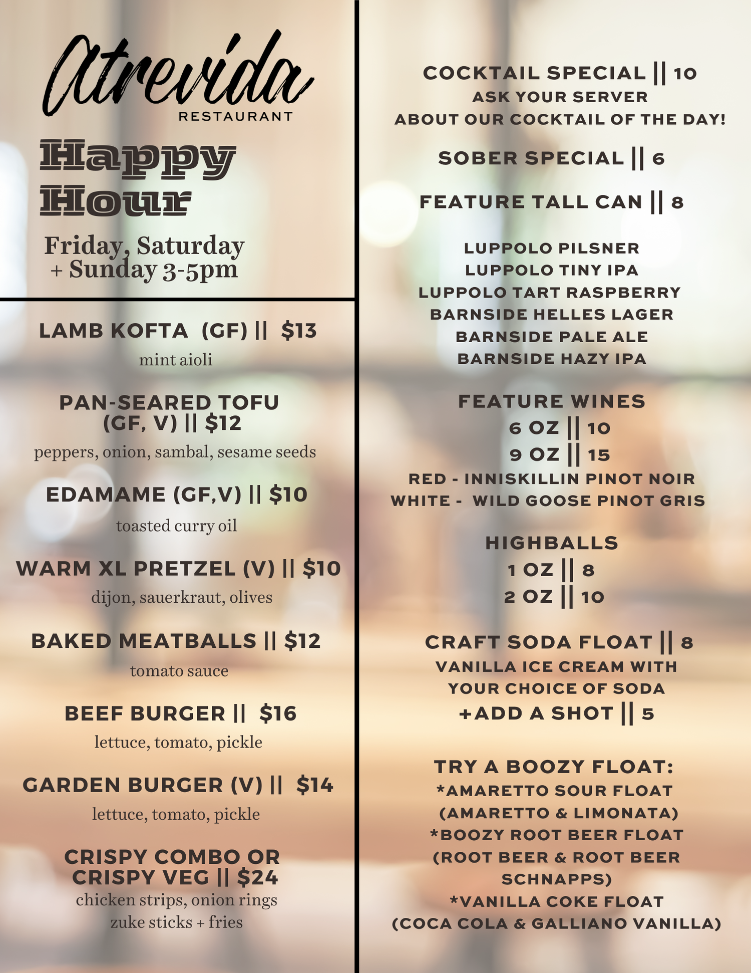 Every Friday, Saturday + Sunday from 3-5PM, we will be serving our delicious cocktail, beer, wine and sober specials in our Orca Lounge and the fireside area of the Atrevida Dining Room. Chef Dean's tasty snack menu is casual and shareable. Cheers to the weekend!