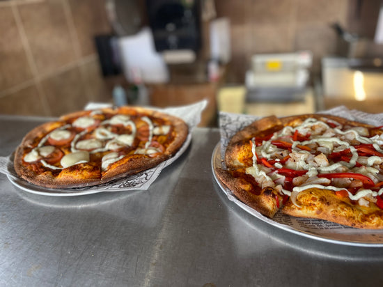 BBQ Sauce, mozza, smoked salmon, onions + capers